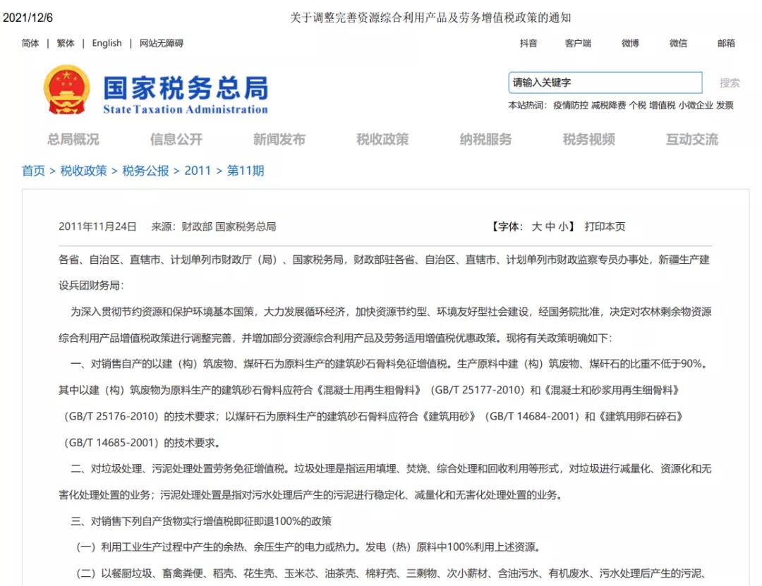 國家稅務總局《關于調(diào)整完善資源綜合利用產(chǎn)品及勞務增值稅政策的通知》,明確指出: 為深入貫徹節(jié)約資源和保護環(huán)境基本國策,大力發(fā)展循環(huán)經(jīng)濟,加快資源節(jié)約型、環(huán)境友好型社會建設,經(jīng)國務院批準,決定對農(nóng)林剩余物資源綜合利用產(chǎn)品增值稅政策進行調(diào)整完善,并增加部分資源綜合利用產(chǎn)品及勞務適用增值稅優(yōu)惠政策。
