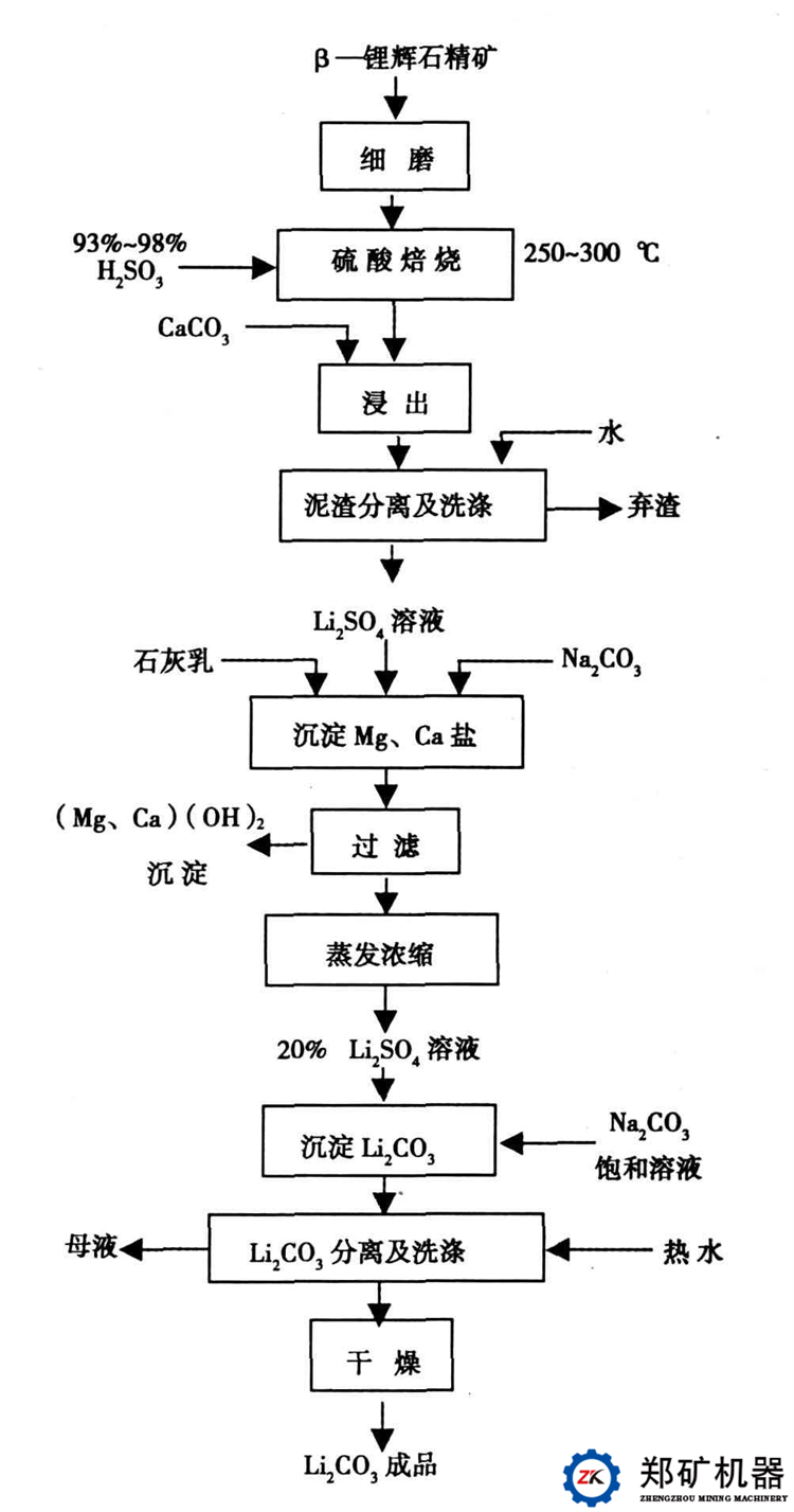 以鋰輝石為原料生產(chǎn)碳酸鋰,工業(yè)上比較成熟的工藝是硫酸法生產(chǎn)工藝。此工藝的基本原理在于硫酸與β-鋰輝石在250~300℃下發(fā)生置換反應(yīng),生成Li2SO4。反應(yīng)方程如下: